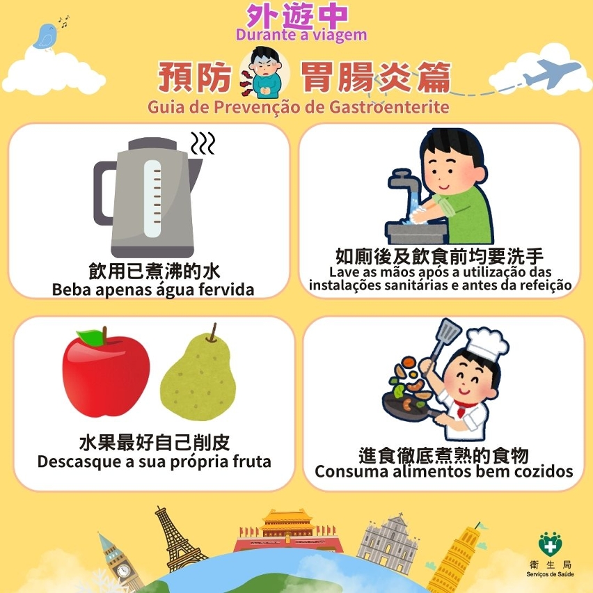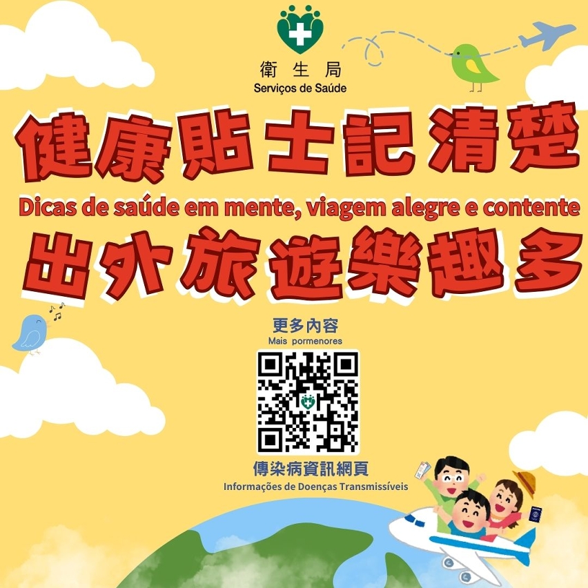 為加強居民健康意識,衛生局已與治安警察局、海事及水務局及民航局跨部門合作加強宣傳,在各陸路邊境口岸大樓、碼頭及澳門國際機場播放外遊健康訊息。更多預防疾病相關資訊,可瀏覽衛生局傳染病資訊專頁 https://www.ssm.gov.mo/portal/csr/ch/main.aspx 及衛生局疫苗資訊網 https://www.ssm.gov.mo/vaccine。