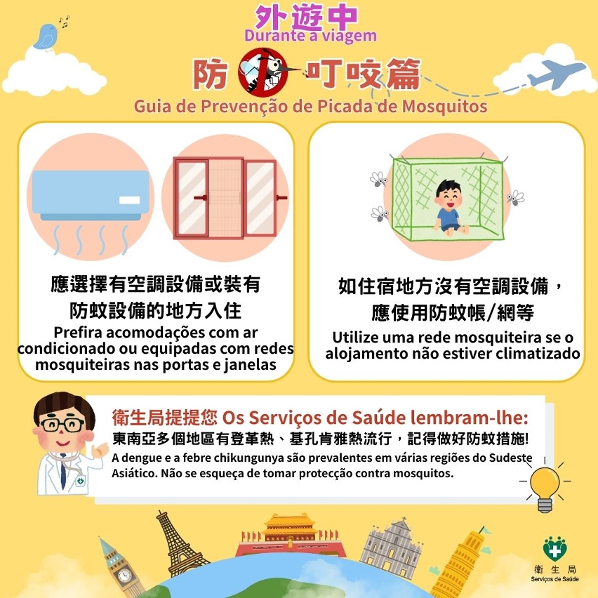 居民於外遊返澳後,應密切留意自身健康狀況。若出現發燒、咳嗽、皮疹、嘔吐或腹瀉等不適症狀應立即就醫,並務必告知醫生相關旅遊史、接觸史及是否曾被蚊蟲叮咬,以便能獲得適切治療。